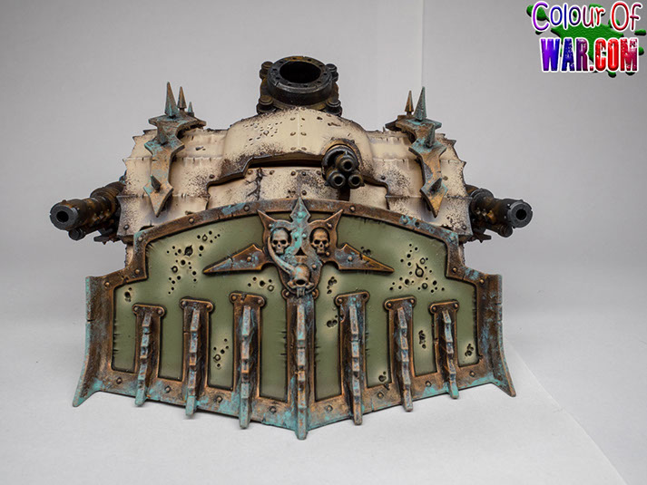 The Deathguard armoured machines such as the Plagueburst Crawler allow for some fun painting and modelling; the key areas of interest on this model are the rust/weathering which was applied with a sponge in various layers, corrosion on the dozer blade and verdigris to finnish the bronzed areas. It was fun experimenting with moving into the browns from the bonewhite base I chose to use.