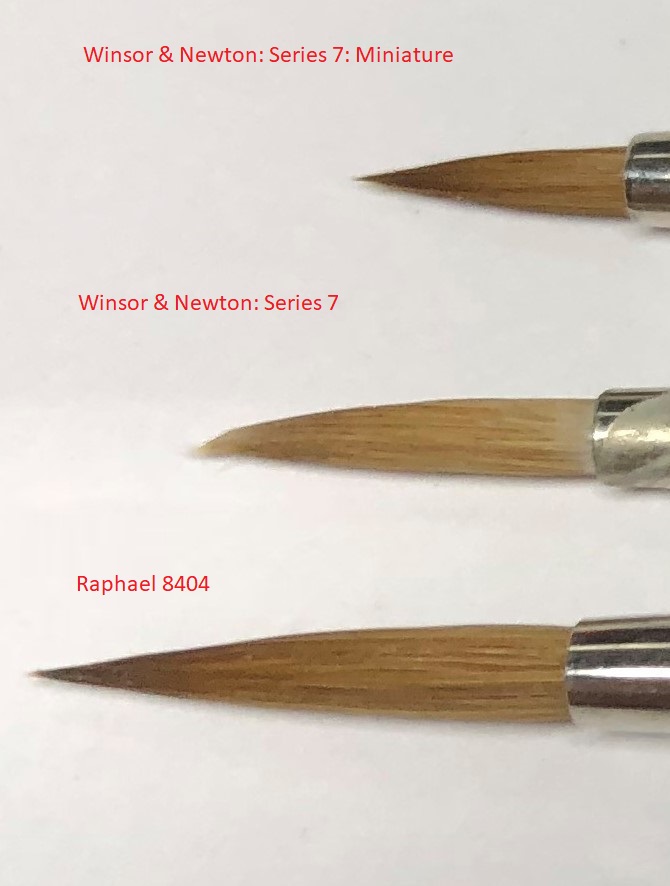 The Series 7 has slightly more hairs at the Ferrule, however the 8404 has a wider body with longer hairs which provides a larger reservoir, holding more paint and keeping it wet for longer which I have found to be a real benefit since using them. Of the three brushes here the W&N Miniature brush has short hairs which provide the ability to paint clear detail but sacrificing painting time as the shorter hairs lead to the paints drying much faster. The hairs in the 8404 seem to be more coarse and have more spring and whilst the body is wider, the point is excellent and even using a size 1 brush (the equivalent of a Series 7 size 2) I am confident in painting most detail.